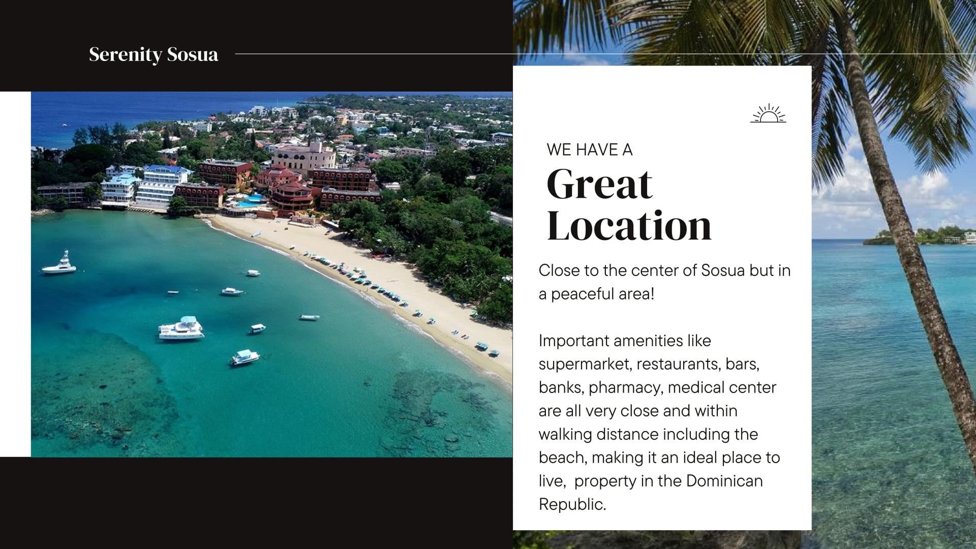 The development is located in a peaceful residential area of Sosúa, just a 12-minute walk (900 meters) from the beach.
